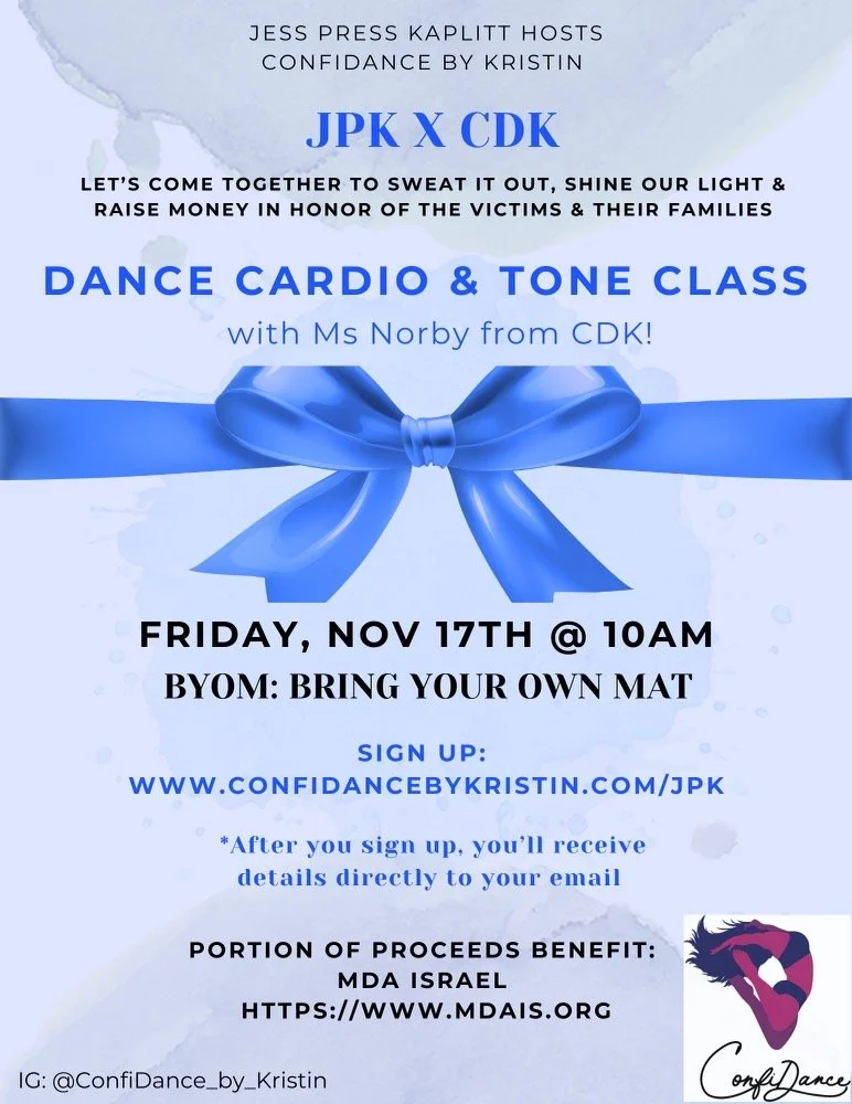 On 10/23/23 Jessica Kaplitt hosted her first ConfiDance by Kristin fundraiser through a high-energy dance and cardio class with all proceeds benefitting MDA Israel. The class was a total success and most importantly everyone left in the vibration of gratitude and love.
